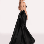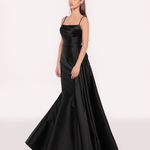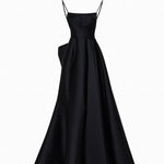 Minimalist bir zarafete sahip bu sofistike gece elbisesi, ince askılar ve hafif bir su damlası yaka ile öne çıkıyor. Yapılandırılmış üst bölümü, zamansız bir şıklık yayan geniş ve kabarık eteğe akıcı bir geçiş yapıyor; zarif bir duruş sergilemek için mükemmel bir seçim.