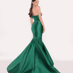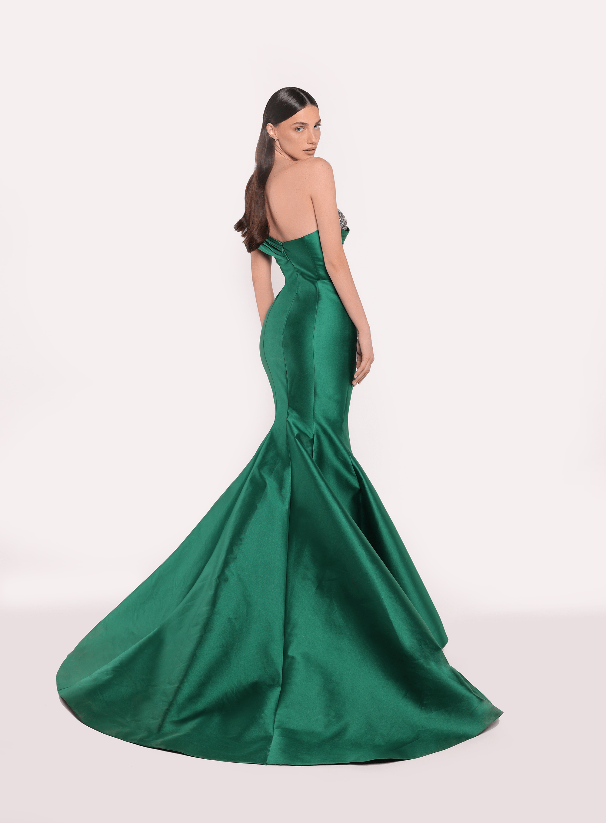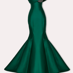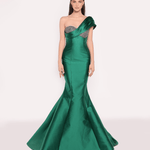 Tek omuz detayına sahip, vücuda oturan ve dramatik bir balık etekle tamamlanan zarif bir elbise. Asimetrik yakası, omuzda zarifçe drapelenmiş detaylarla zenginleştirilmiş ve gövdedeki ışıltılı dokunuş, elbiseye zarafet katıyor.