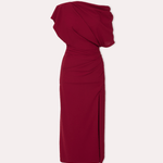 Tek omuz tasarımı ve yumuşak drapeleriyle dikkat çeken şık bir midi elbise. Yanındaki yüksek yırtmaç detaylarıyla zarif bir feminenlik sunar ve özel davetlerde fark yaratır.