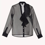Bu transparan bluz, ön kısmındaki fırfır detayı ve yapısal manşetleriyle dikkat çekiyor. Hafif kumaşı ve zarif silüeti, modern bir sofistike görünüm için şık bir tercih sunuyor.