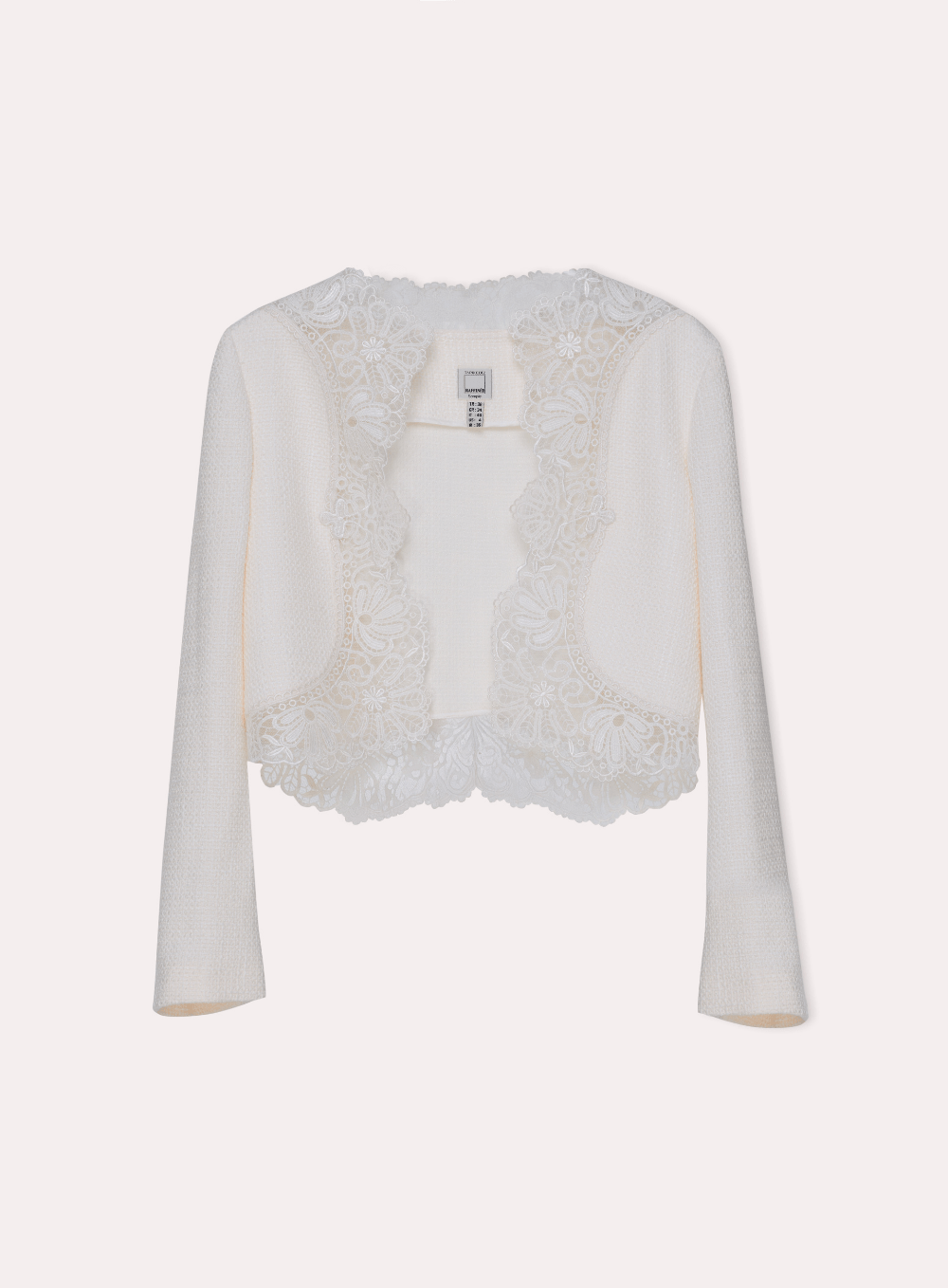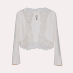Kısa kesim dokulu ceket, kenarlarında zarif dantel detaylarıyla şıklık katıyor. Elbiselerin veya gece kıyafetlerinin üzerine şık bir tamamlayıcı olarak idealdir.