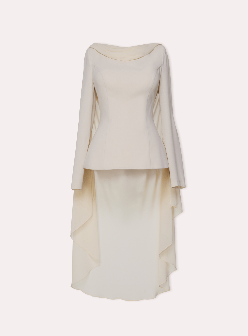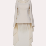 Bu zarif takım, drape yakası ve akan şifon detaylarıyla zarif bir silüet sunuyor. Resmi davetler için ideal olan bu tasarım, zahmetsiz bir şıklık yansıtıyor.