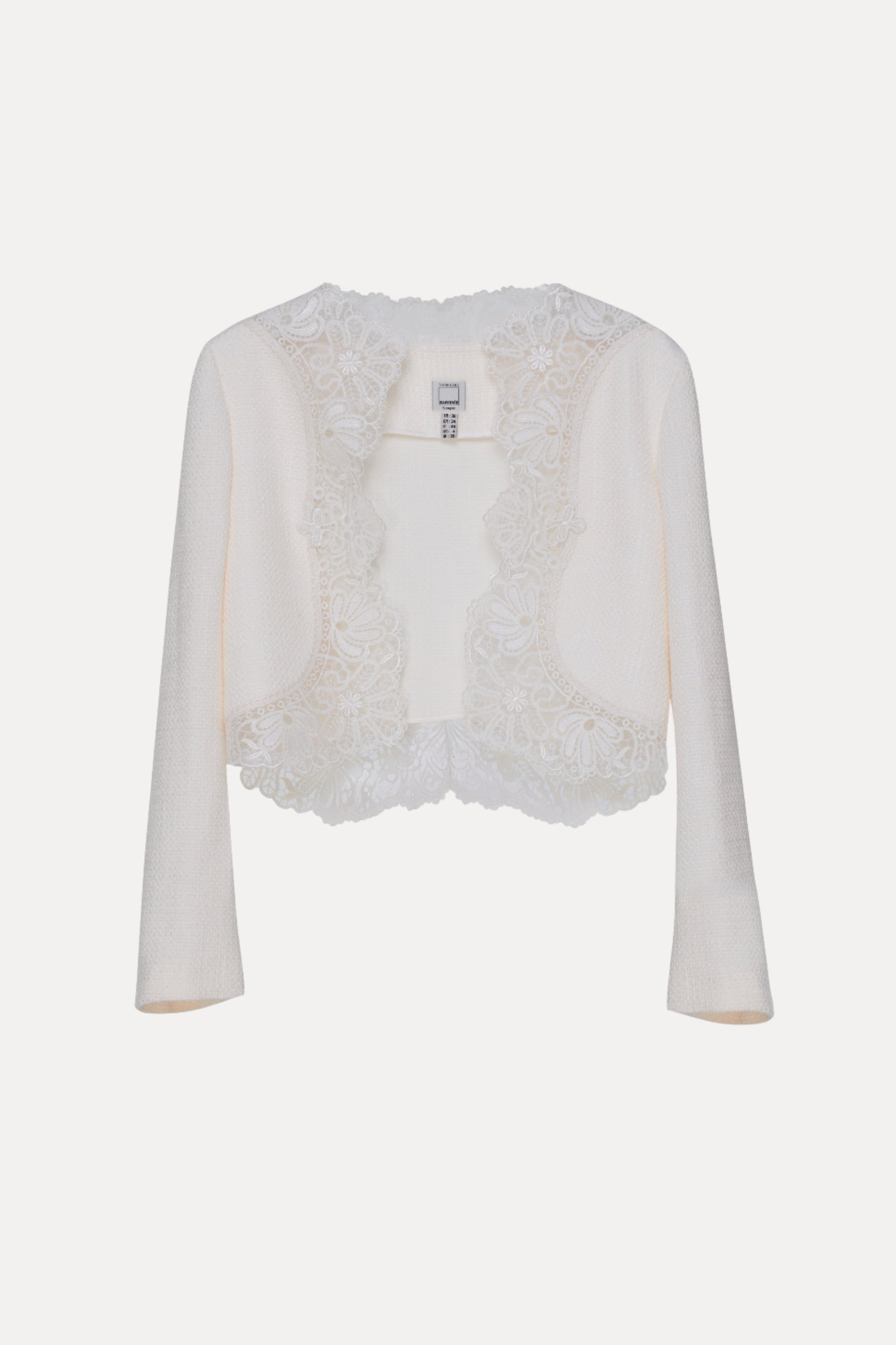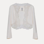 Kısa kesim dokulu ceket, kenarlarında zarif dantel detaylarıyla şıklık katıyor. Elbiselerin veya gece kıyafetlerinin üzerine şık bir tamamlayıcı olarak idealdir.