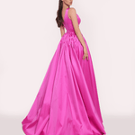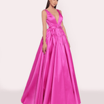 Bu elbise, modern sofistikasyonu klasik bir zarafet dokunuşuyla birleştiriyor. Dekolteyi vurgulayan derin V yaka, beldeki kemer detayıyla birleşerek volümlü eteğe yapı kazandırıyor. Lüks kumaş, asil ve heykelsi bir siluet yaratıyor. Büyük bir gece daveti için kusursuz bir seçim.