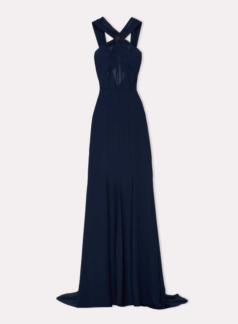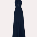 Bu zarif gece elbisesi, çapraz bant detaylı ve ince işlemelerle süslenmiş şık bir yaka tasarımına sahiptir. Yere kadar uzanan silüetiyle hem klasik hem de sofistike bir görünüm sunar.