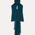 Halter yaka bu üst, zarif boncuk işlemeleri ve akıcı şifon tasarımıyla öne çıkar. Anahtar deliği detayı ve arkadan dökümlü tasarımı, zarif ve akıcı bir görünüm için ideal bir dokunuş sunar.