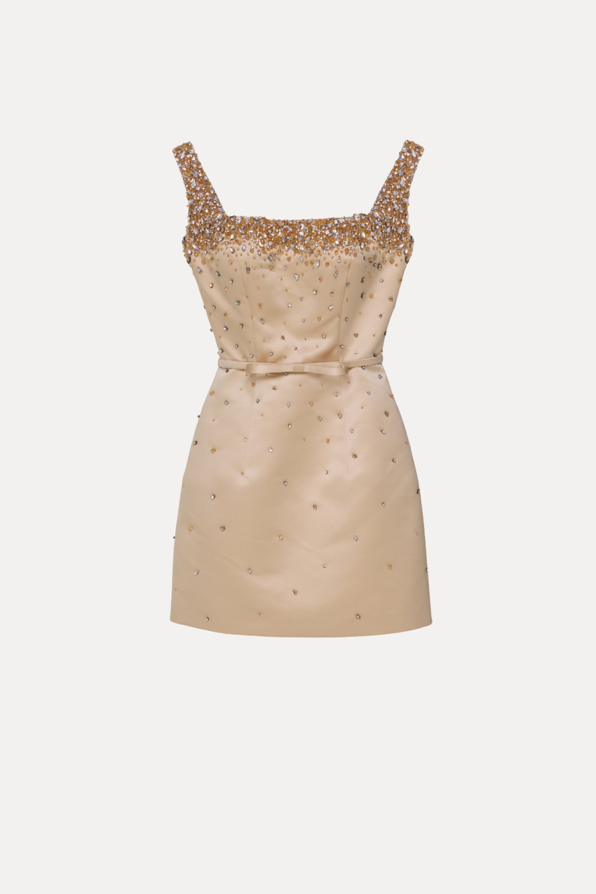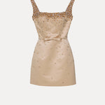 Bu mini elbise, kare yakası ve ışıltılı omuz detaylarıyla zarafeti ön plana çıkarıyor. Silueti vurgulayan dar kesimi sayesinde, her ortamda zarif bir duruş sergilemek için mükemmel bir seçim.