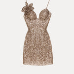 Bu göz alıcı mini elbise, detaylı payet işlemeleri ve kalp şeklinde bir yakayla parıldıyor. Omuzdaki zarif fiyonk detayı ile tamamlanmış, ışıltılı bir duruş sergilemek isteyenler için ideal.