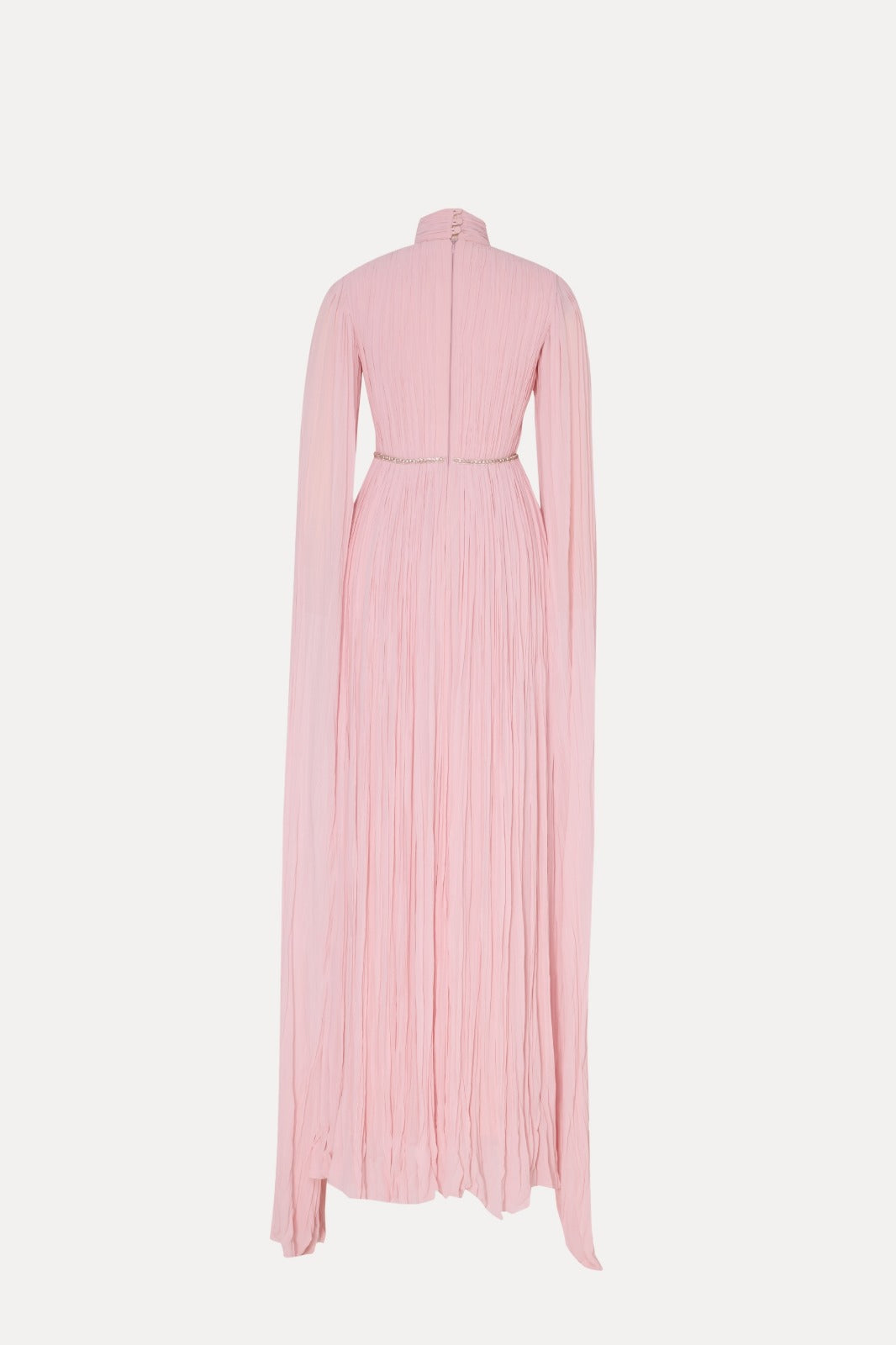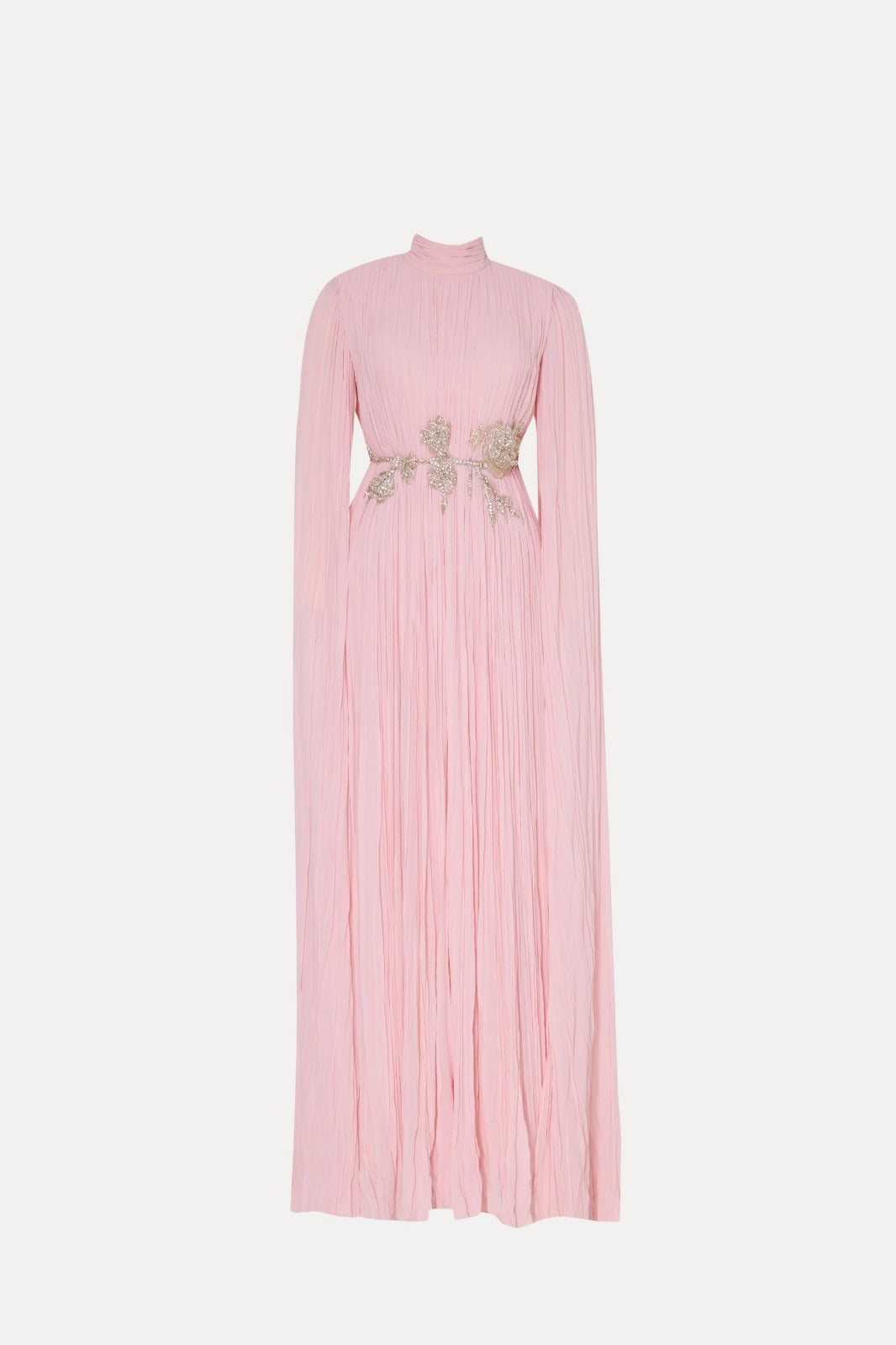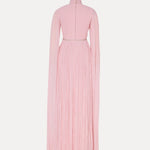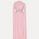 Bu zarif yüksek yaka elbise, silüet boyunca süzülen şık bir pelerine sahiptir ve asil bir duruş sergiler. Beldeki ince işlenmiş çiçek detayları zarafeti tamamlayarak, bu parçayı zarafet arayanlar için mükemmel bir seçim haline getiriyor.