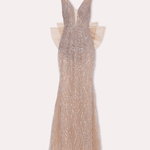 Bu zarif elbise, her hareketle parıldayan detaylı boncuk işlemeleri ile dikkat çekiyor. Derin yakası ve ince tül detayları cazibe katarken, yumuşak tül kuyruğu zarif bir görünüm yaratarak elbiseye büyüleyici bir hava katıyor.