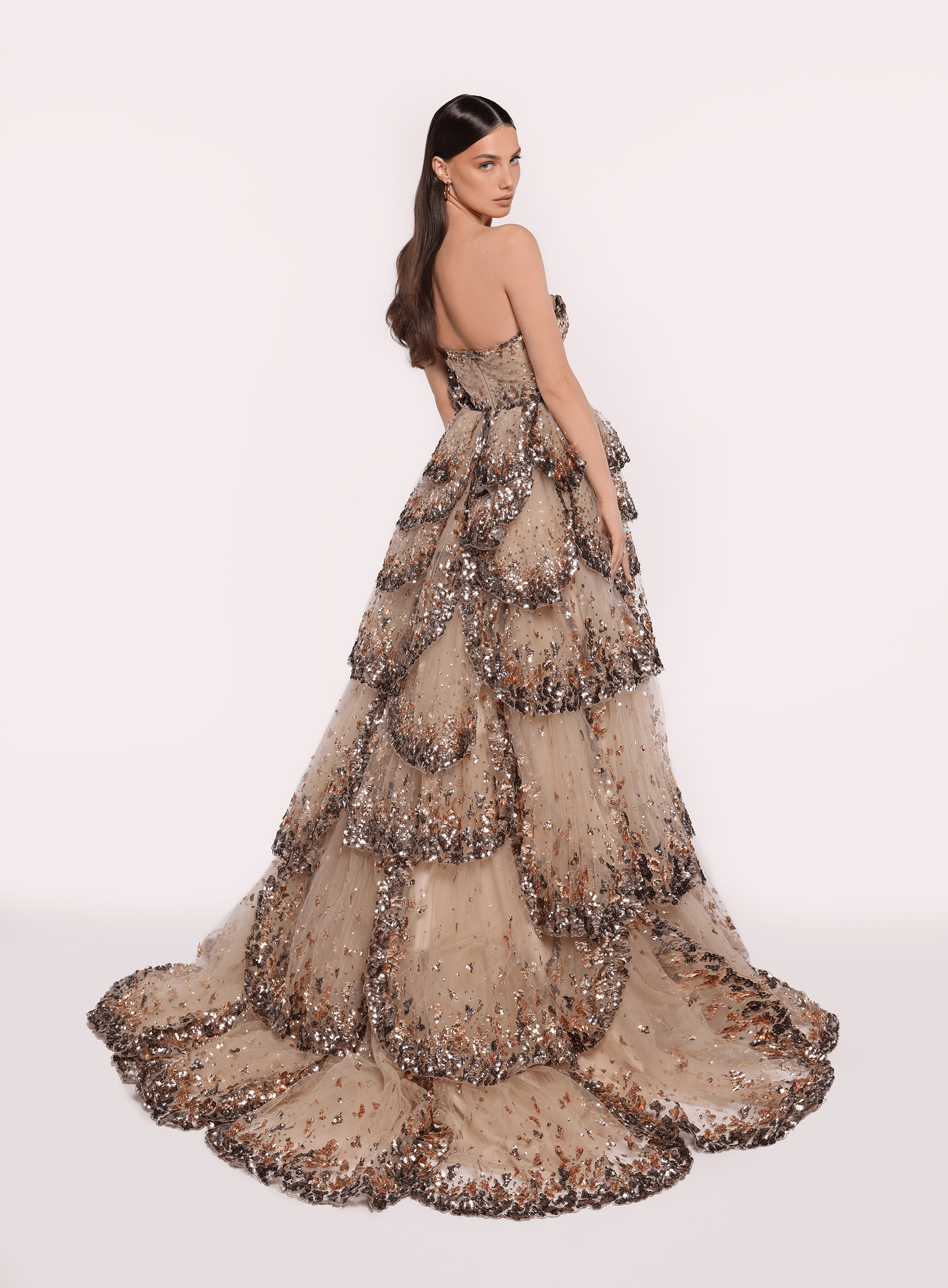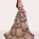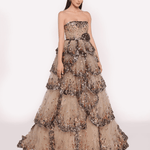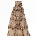 Bu nefes kesici straplez elbise, katmanlı kabarık eteğiyle dikkat çekiyor. Zarif dalgalar halinde süzülen parıltılı payetlerle baştan aşağı süsleniyor. Beldeki özenle işlenmiş çiçek detayı, romantik bir dokunuş katarak bu elbiseyi görkemli davetler için büyüleyici bir seçim haline getiriyor.